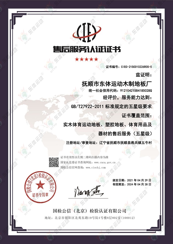 “東體運動”木地板系列產品已經通過國際籃聯檢測、世界羽聯認證、歐盟體育地板專項標準CE認證、歐盟環保產品CE認證、FSC世界森林協會認證、五星級售后服務企業認證等,是中國職業籃球俱樂部遼寧沈陽三生飛豹籃球俱樂部官方合作伙伴,內蒙古籃球協會戰略合作伙伴。